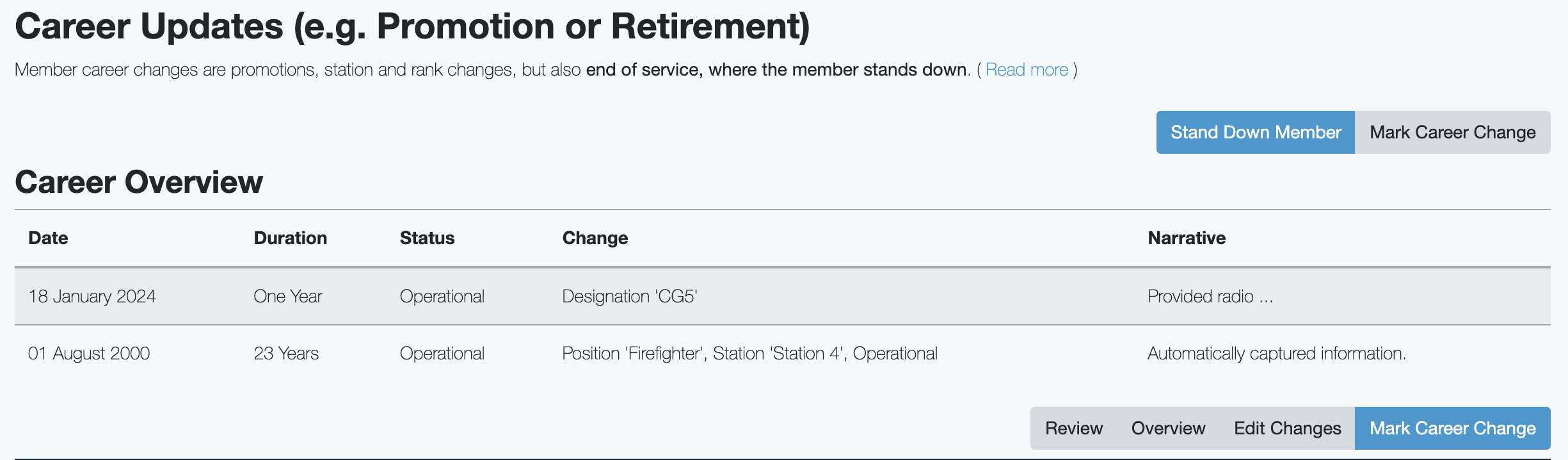 | Mark Career Change | Add a general change | e.g. Promotion to Officer |