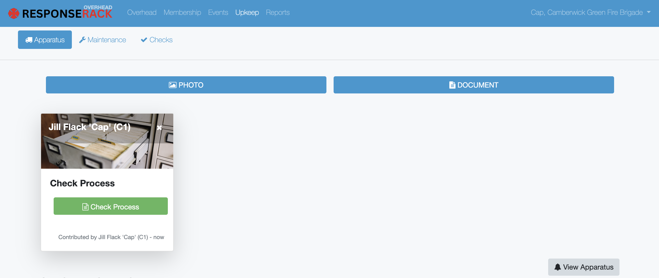 Visit the "Overhead View" and provide a check process document as an attachment for any apparatus. The document can include what to check, how to check it, and things like how many to expect.